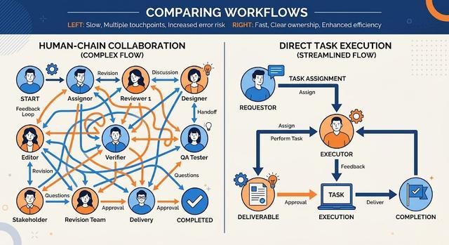 是:所有协作行为,都需要经过人的节点中转。你需要告诉另一个人去做什么,然后等他做完,然后再告诉下一个人。任务的流转,就是信息在人与人之间的传递。这是过去三十年所有协作工具的共同预设,没有例外。