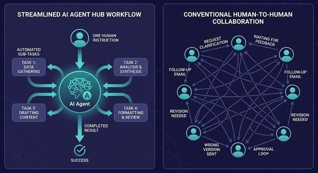 Agent介入之后:整个任务的状态对所有人实时可见,因为所有子任务都在同一个Agent管理的上下文里。你不需要问”进行到哪了”,因为Agent会在”你现在可以开始X了”的那一刻主动告诉你——而不是等你来问。